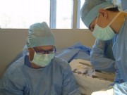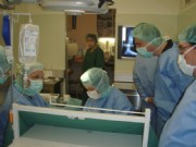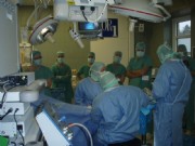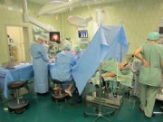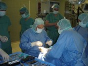Center and right: The operating theatreof the Prague University Hospital during a course . The live image was transferred to the lecture hall, and then questions were asked by colleagues and answered by me during surgery
