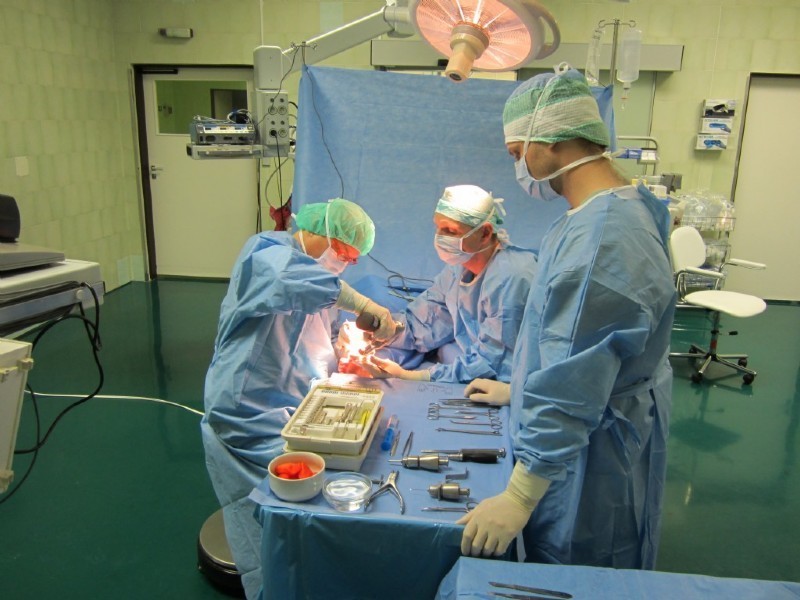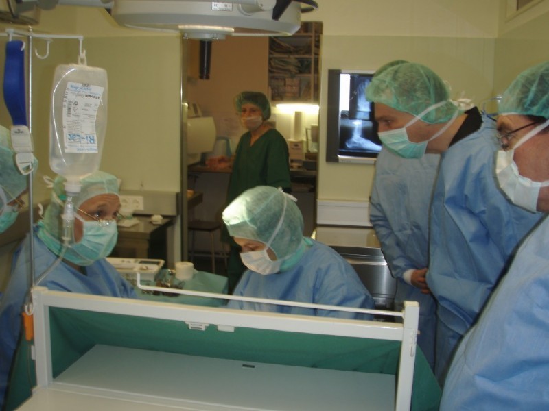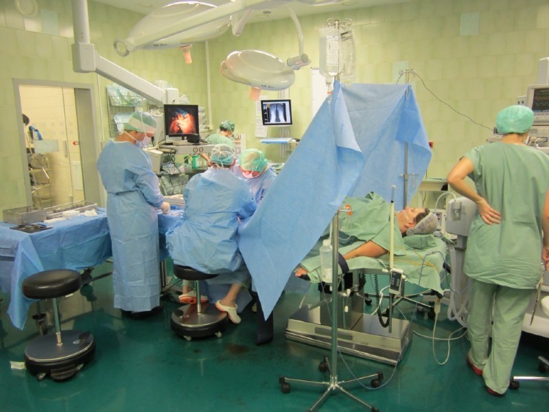 Center and right: The operating theatreof the Prague University Hospital during a course . The live image was transferred to the lecture hall, and then questions were asked by colleagues and answered by me during surgery