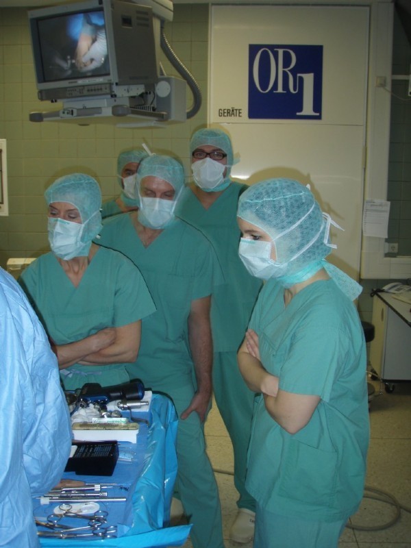 Right: Virginia Vitek with the top foot surgeons Springfeld, Zwipp and Stainsby, in the background Roland Woerner , CEO (together with Uwe Pech) of the company Normed, D-day, Heidelberg