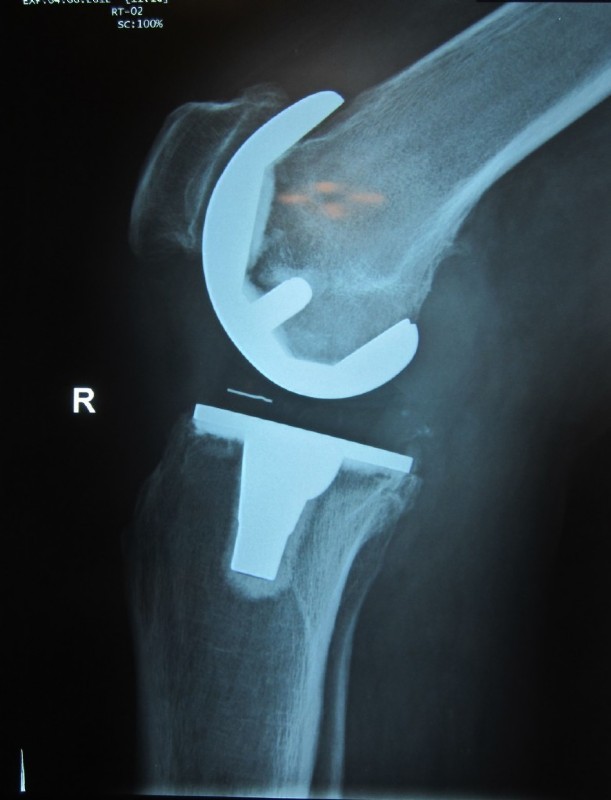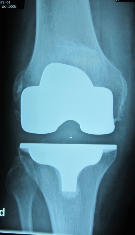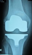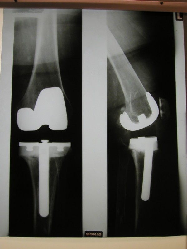 An older total endoprothesis inluding replacement of the kneecap. However, today, we replace kneecaps only very rarely.