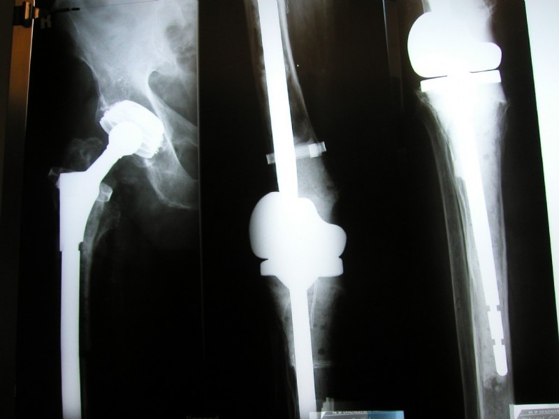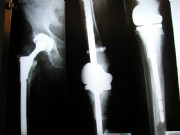 Right: A so-called "total femur": A solution for desperate cases, in which there is no other way to preserve the limb: The hip (left) and knee (center and right) had to be completely replaced in a session. The anchorage is deep into the lower leg. The hip and knee part are strongly connected through the femur. It is a so-called tumor prosthesis.