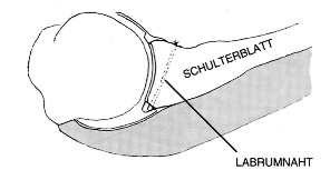 Under arthroscopic observation, the torn labrum is fixed to the acetabular rim with a special stitching technique and the loose joint capsule gathered so that the humeral head can no longer leave the glenoid.